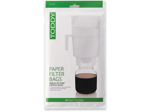 Toddy® Paper Filter Bags in resale packaging. Ideal for cold brewing up to 1 pound of coffee, these filters are compatible with the Toddy® Cold Brew System.