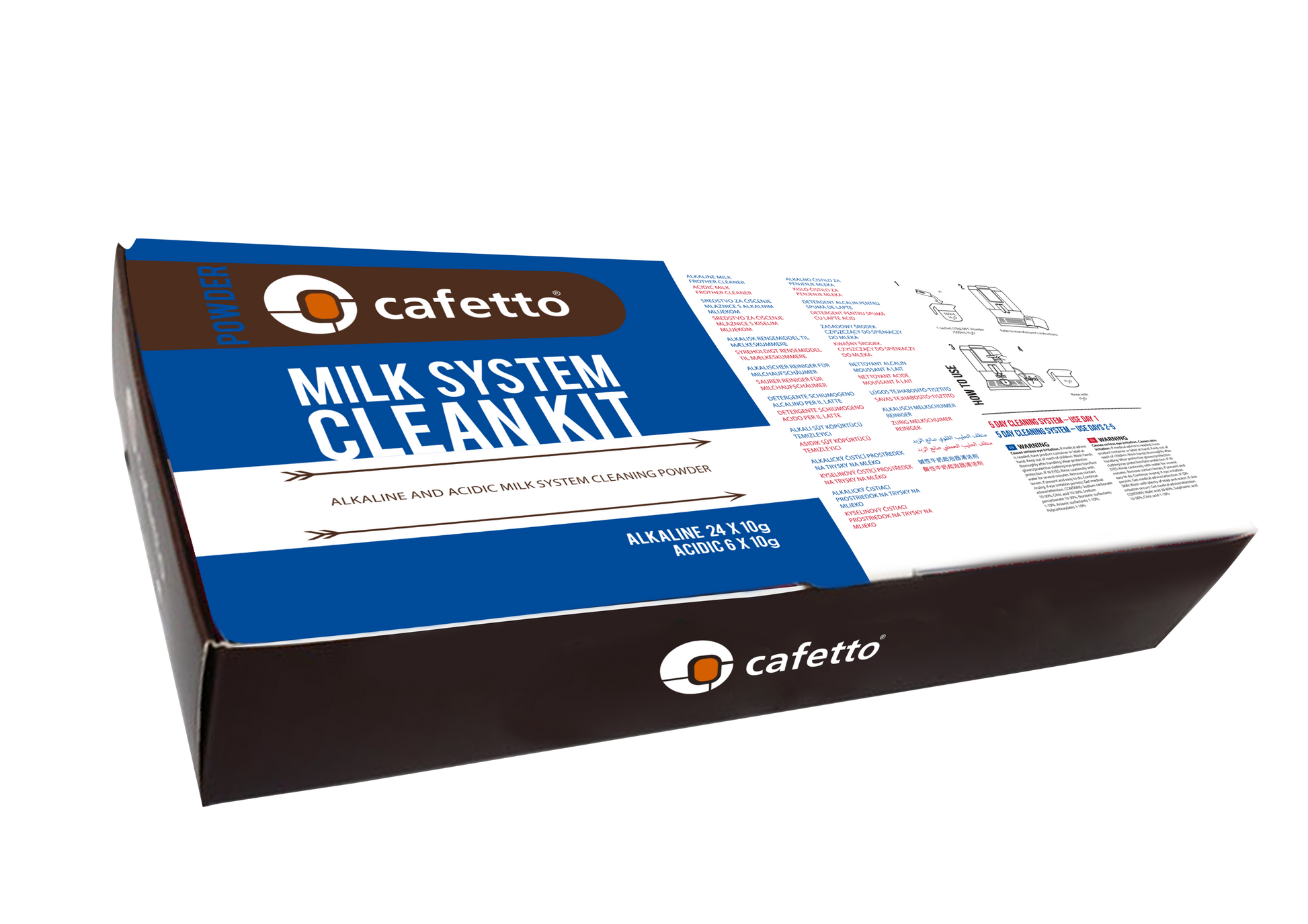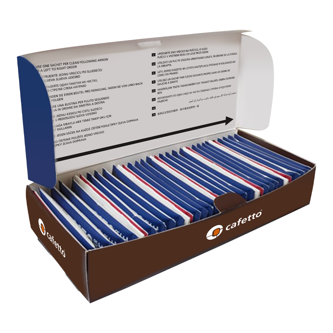 Cafetto Milk System Clean Kit is packed with 6 cycles of both alkaline and acidic cleaners.