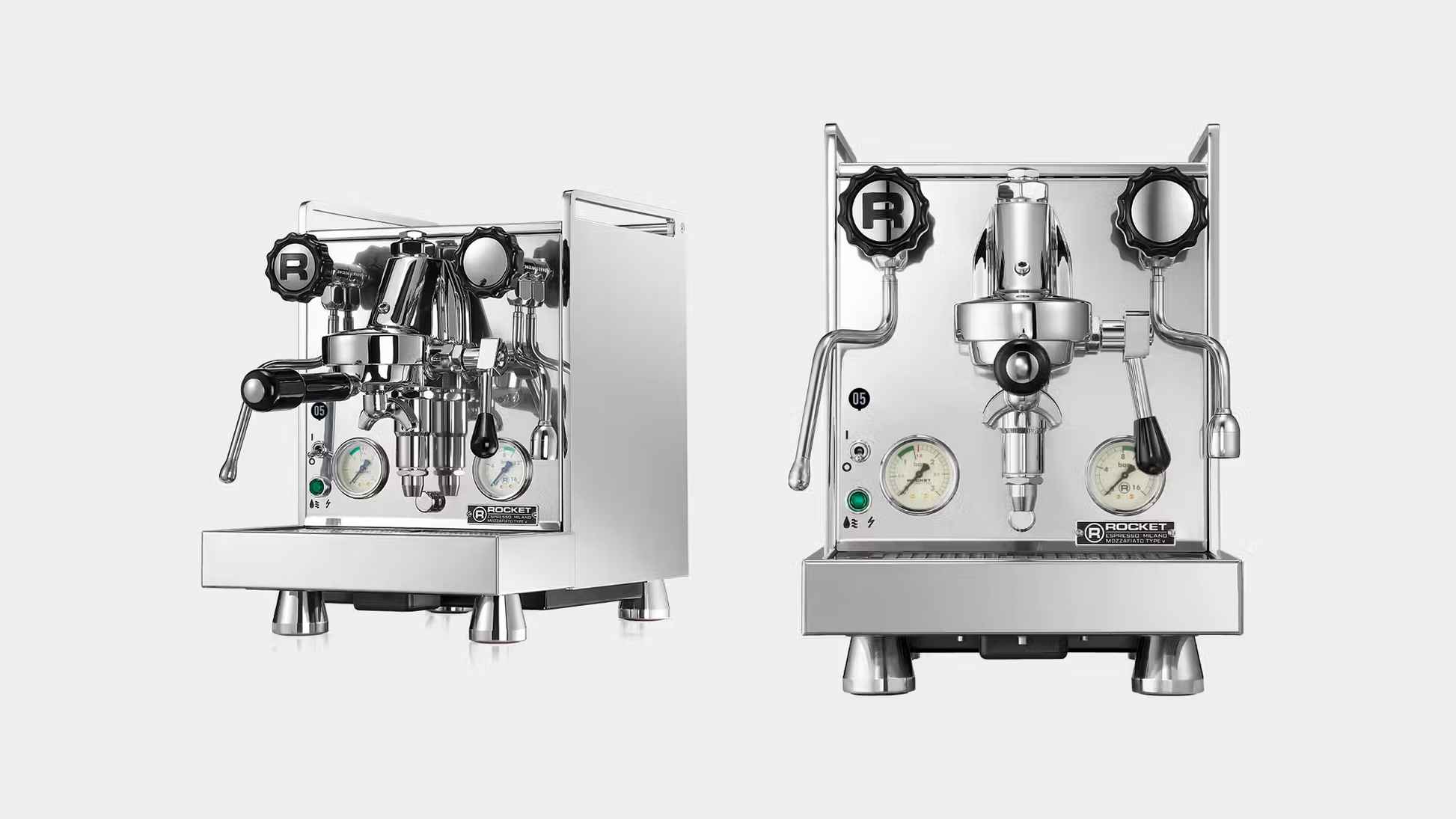 he Cronometro V model is offered in two different body styles, both with heat exchanger PID temperature control technology. A digital shot timer allows the user to better optimise extraction time. Temperature control is optimised through a PID controller drawing on 4 different signal parameters to ensure stability and optimum results in the cup. An adjustable temperature display allows the user to select individual brewing temperatures for different coffee types and roast styles. The Giotto and Mozzafiato Cronometro V machines introduce users to the Rocket Espresso movement for better espresso in the home without compromise.